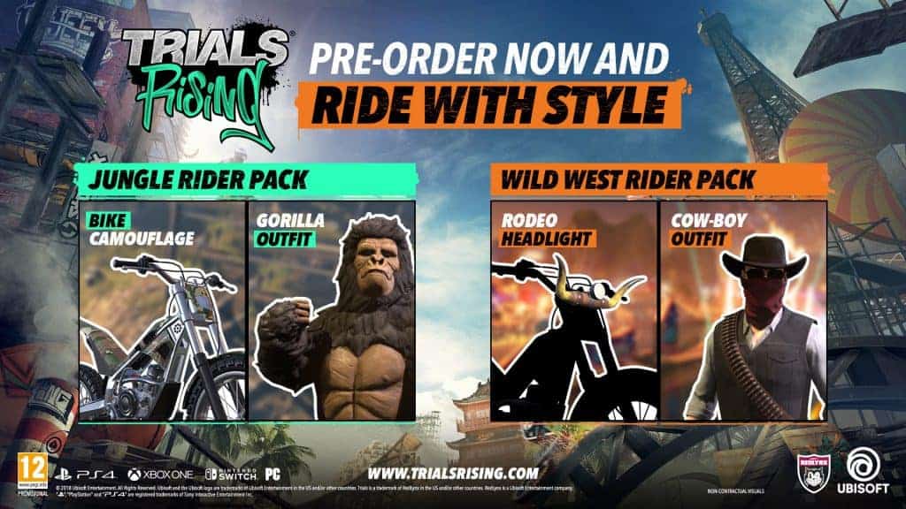 Les précommandes de l’Édition Standard et Gold sont d’ores et déjà possibles. L’Édition Standard de Trials Rising inclut le jeu de base. L’Édition Gold quant à elle inclut le jeu de base ainsi que le Pass Expansion qui comprend deux DLC, des packs de personnalisation, des motos délirantes et plus encore pour 40€. En guise de bonus de précommande, les joueurs pourront retourner à la vie sauvage vêtus d’un costume de gorille et équipés d’une moto camouflage grâce au pack Motard de la Jungle, et arborer une tenue de cowboy ainsi qu’un phare rodéo pour leur moto grâce au pack Motard du Far West. Chaque pack inclura 5 éléments de personnalisation pour le rider et un pour la moto.