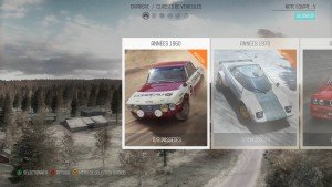 Lors de la première épreuve du championnat de rallye, vous avez le choix entre 3 voitures disponibles (pour ma part j’ai opté pour la mythique Renault Alpine). A partir de là, votre but sera de vous placer le mieux possible dans toutes les courses auxquelles vous participez pour remporter le plus de crédits possibles.