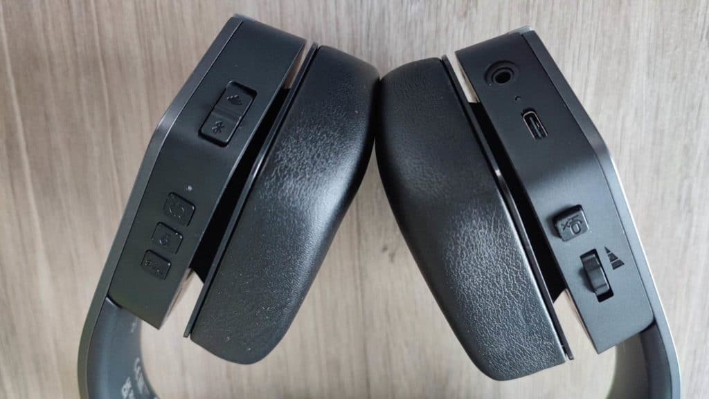 Sur le côté droit, on retrouve un commutateur pour passer de la connexion Bluetooth à la connexion Wi-Fi mais aussi le bouton power, DTS et celui pour activer l’éclairage RGB. Sur la gauche, on retrouve l’entrée pour fixer le micro, le câble USB-C et le jack. Enfin, on a par ailleurs le bouton mute et la mollette de volume.