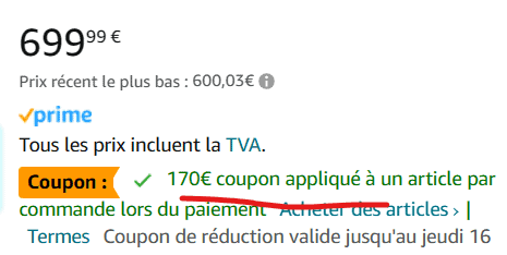 Avant de vous parler des promotions, je voulais insister sur le fait que sur Amazon, vous devez cocher “appliquer le coupon” pour bénéficier des grosses ristournes :