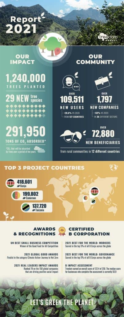 - En 2021, Treedom a attiré plus de 72 000 nouveaux participants à son projet, notamment des agriculteurs, dans le monde entier.
