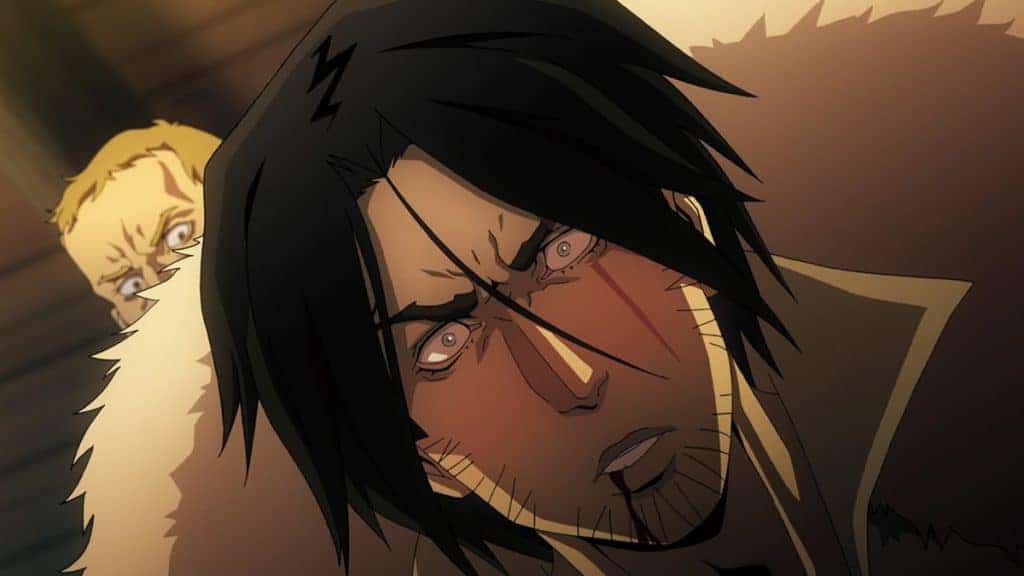 En plus d’être courte, Castlevania multiplie les irrégularités. À commencer par le dessin et l’animation. Si les traits restent corrects, ils mélangent les genres et prête à confusion. On sent une patte artistique occidentale, avec quelques tons empruntés à la japanimation. Jusque là, rien de grave. Là où ça coince, c’est avec ces plans qui semblent tout droit sortis d’un dessin animé US des années 90 (et je doute que ce soit un choix). Une impression confirmée par des animations lentes et dignes des meilleurs dessins animés sortis directement en VHS à la bonne époque (genre le personnage qui marche en se balançant mécaniquement). Si je parle d’irrégularité, c’est parce que les combats gagnent en dynamisme et flattent la rétine. Nerveux, bien animés, ils frustrent par leur petit nombre : 2 vrais affrontements, dont un qui donne l’impression d’assister à un combat de boss de jeu vidéo (un coup de génie, bravo !).