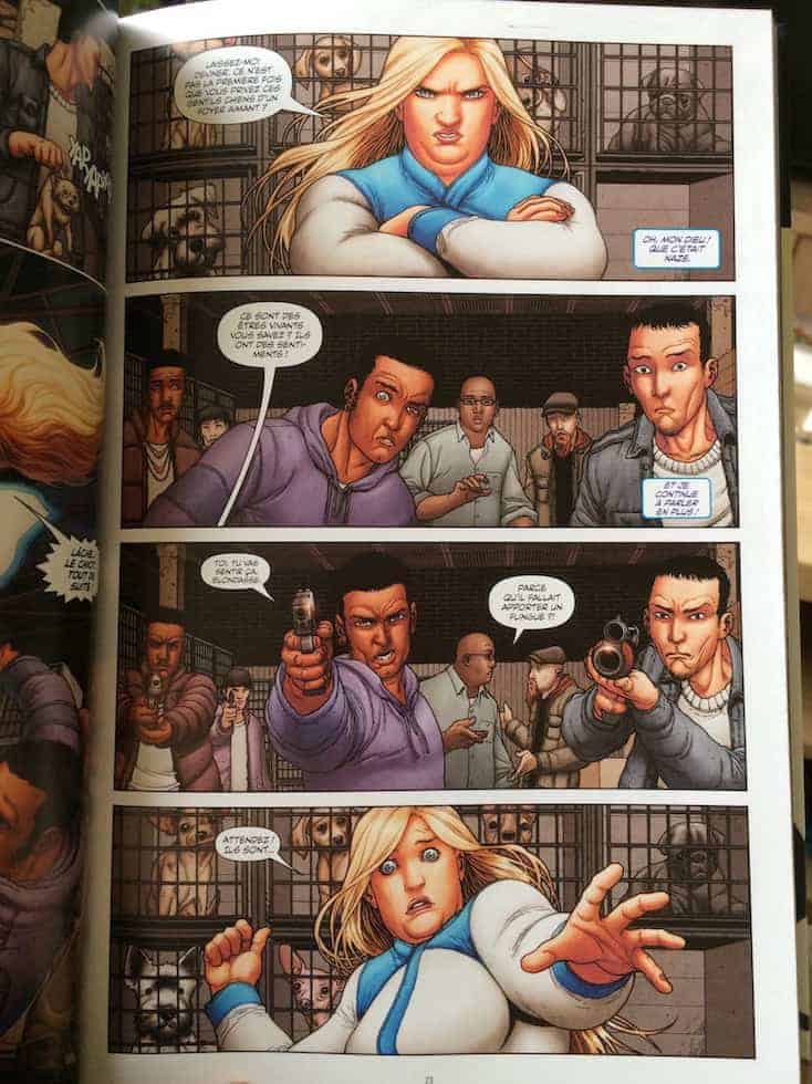 Côté artistique, Francis Portela, Marguerite Sauvage et Andrew Dalhouse sauvent les meubles en nous offrant de superbes planches. Tantôt pop art dans les songes de Faith, ensuite réaliste lors des combats intenses fort bien mis en scène. J’adore ! Reste à voir si on ne leur a pas trop demandé de mettre en avant les formes généreuses de Zéphyr. Qu’on se comprenne bien, je n’ai aucun souci avec les formes de Faith elle n’en reste pas moins superbe, mais ce serait dommage qu’elle ne se résume qu’à cela.