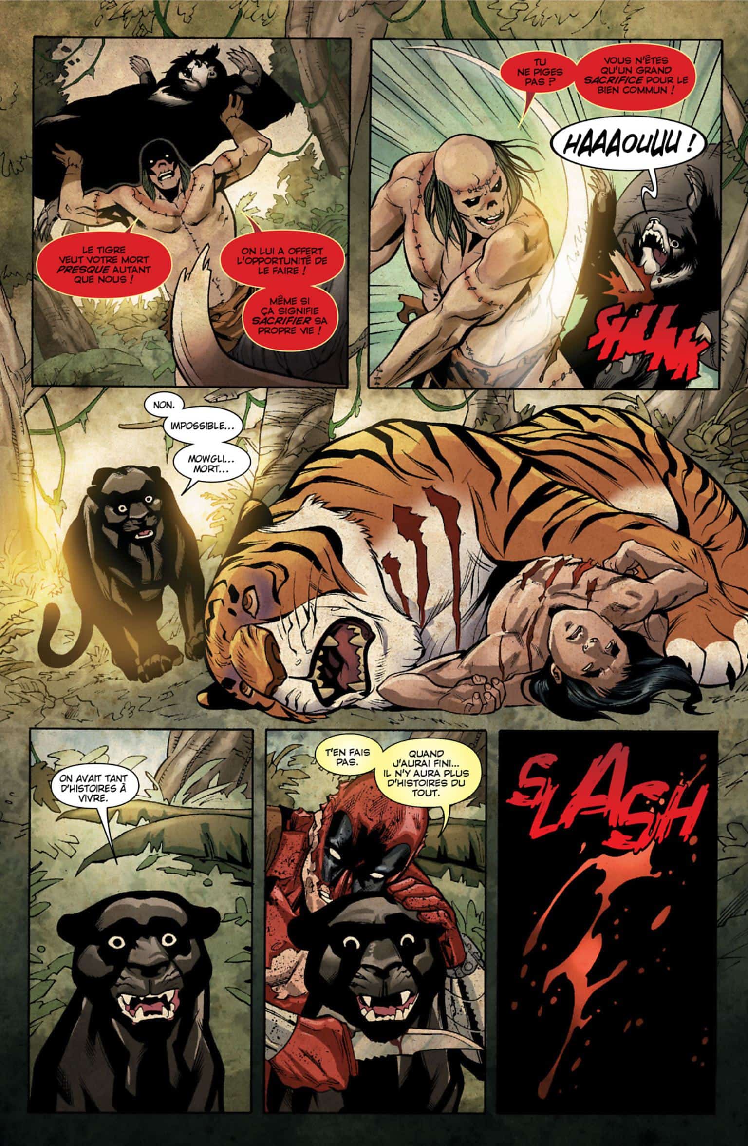 Le second volet part de la réflexion de notre piscine de la mort qui consiste à se dire que tout personnage découle d’une histoire dite “classique” plus ancienne. Et c’est vrai que d’imaginer que Namor soit inspiré de la petite sirène est assez comique. Chose étonnante c’est que si Deadpool a éliminé d’une façon déconcertante ses collègues il va galérer face à Mowgli. Mais cela est voulu par les auteurs alors pourquoi pas.