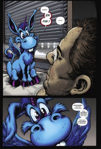Si je n’avais pas vu la série je vous aurais sûrement dis que pour être dans un comics à son propre nom, Happy y est sous exploité. Mais heureusement les auteurs ont changé la donne en nous sortant une série haute en couleurs (mais j’y reviens plus tard).