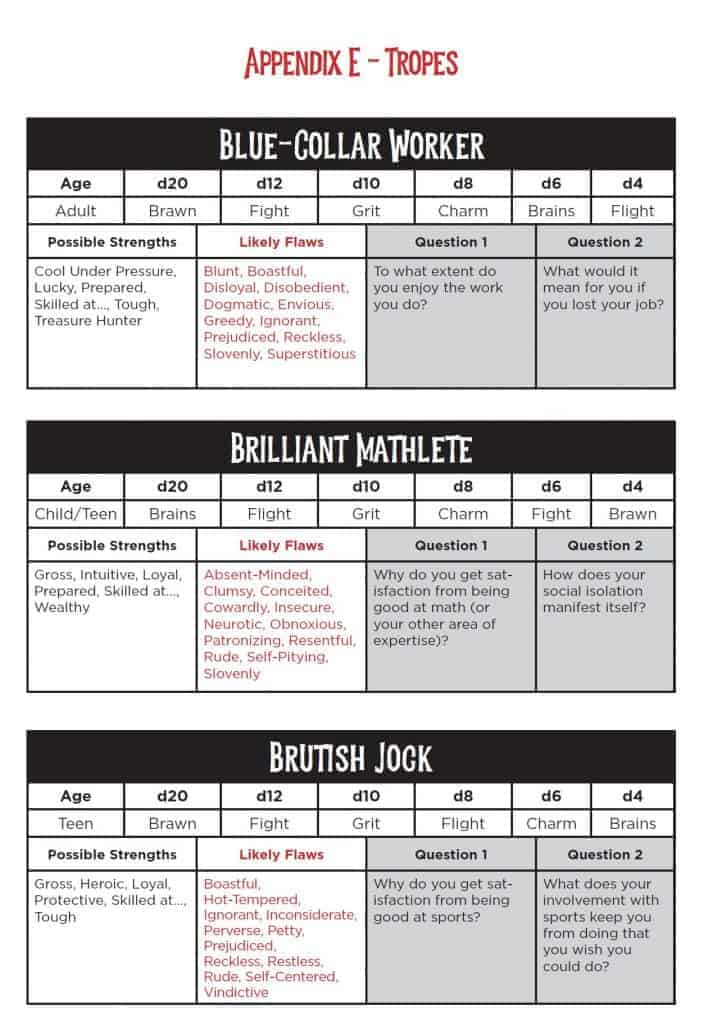 - Appendix E – Tropes (6 pages) est un annexe listant les 15 archétypes avec leurs dés et les questions auxquelles les joueurs doivent répondre à la création de leur personnage ;