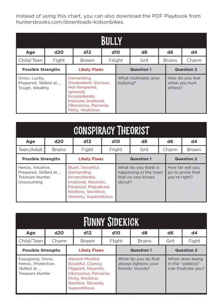Par ailleurs, si Kids on Bikes semble s’inscrire dans la vibe Stranger Things, le jeu s’avère moins contraignant en matière d’univers que Tales from the Loop, par exemple. On peut y jouer dans les années 60 comme à notre époque. De même, aucune obligation d’incarner des enfants, le jeu proposant trois catégories d’âge – enfant, adolescent ou adulte, avec un impact narratif et mécanique. On se retrouve avec un cadre de jeu riche et que les joueurs s’approprient immédiatement, puisqu’ils en sont les créateurs. Le seul conseil donné par le bouquin et que j’ai trouvé plutôt amusant, c’est de se retrouver dans une ville assez éloignée des métropoles pour que tout le monde se connaisse, et assez proche pour que les hélicoptères noirs du gouvernement arrivent en cas de pépin. De quoi planter l’ambiance, sans plus.