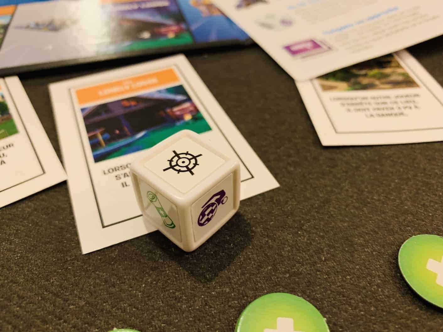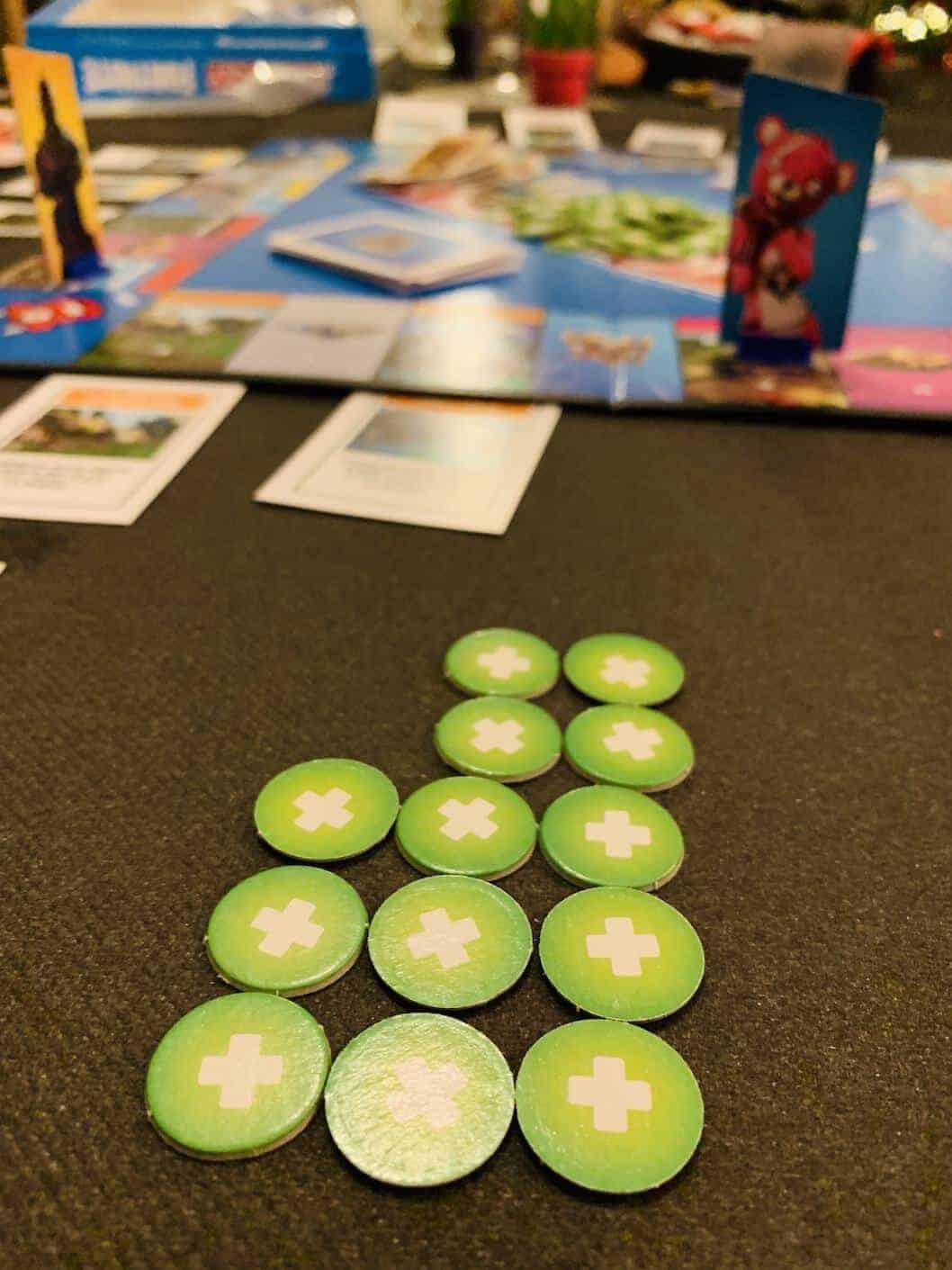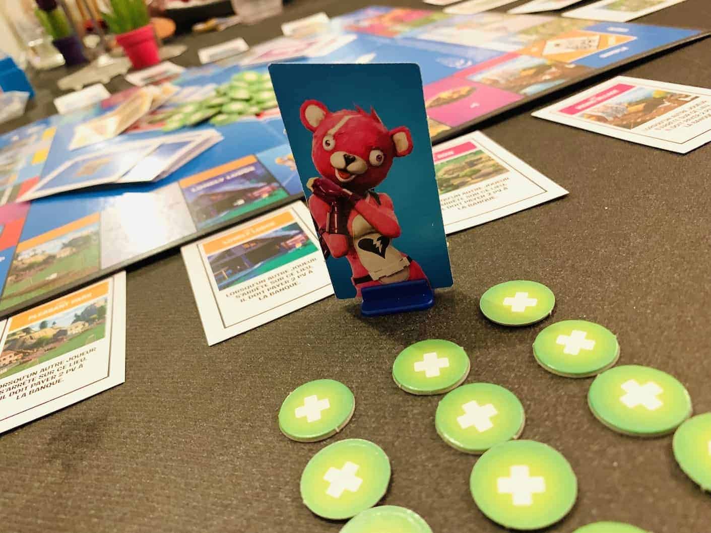 Ce point négatif concernant Monopoly Fortnite étant dit il nous reste le jeu en lui même. Je préfère vous le dire de suite, ne vous attendez pas à jouer au Monopoly ! Le but ici sera de survivre le plus longtemps possible. Vous débutez la partie avec 15 jetons faisant office de points de vie. Certaines cases/cartes vous feront perdre des PV, d’autres vous requinqueront d’un ou deux PV.