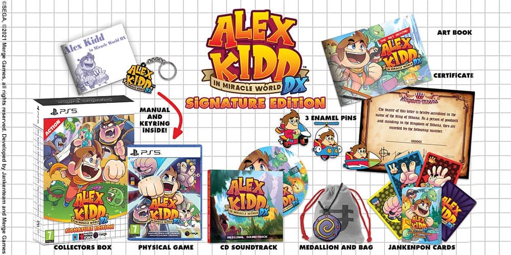- Un exemplaire “region free” d’Alex Kidd in Miracle World DX (incluant un manuel d’instructions et un porte-clés)
