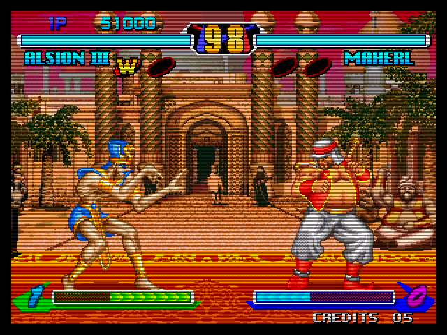 A coté de cela, les décors brillent par leur richesse, les personnages, bien que souvent calqués des belligérants des autres ténors du vs fighting de l’époque, parviennent à dépasser leurs égéries et dégagent une classe folle ! Le nombre des avatars est assez limité mais tient la route. Entre Sho (un Ryu upgradé), Alsion III (Le pharaon inspiré de Dhalsim), Dao Long (Le Bruce Lee-like façon Kim Dragon dans World Heroes), Tia (la babe mix entre Chun Li et Mai), … vous aurez l’embarras du choix. Les musiques sont bien pêchues, les bruitages classiques et la voix off légèrement nasillarde confèrent un côté très manga à l’expérience.