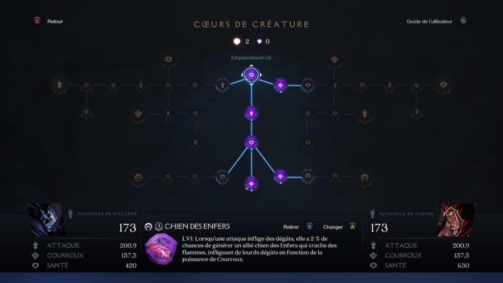 On retrouve également une carte de progression en arborescence qui, grâce aux cœurs de créatures, vous permettra d’améliorer les capacités de vos personnages. Si celle-ci semble difficile à comprendre au début, on finit par s’y adapter. Ainsi on peut trouver les meilleures capacités à ajouter en fonction de notre style (bourrin, sorts, santé…).
