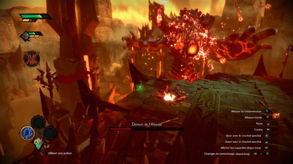 Ce qu’on aime dans Darksiders Genesis c’est avant tout les combats et sur ce coup-là, on est servis. Ceux-ci s’enchainent à un rythme effréné, alternant les monstres de plus en plus spectaculaires. Le tout vous permettant de récolter des items indispensables à votre progression (santé, magie, cœurs…). Le tout est vraiment plus que bien fait et ne souffre que très rarement. Les couleurs et l’hémoglobine explosant aux quatre coins de votre écran. Il ne faudra cependant pas oublier la dimension énigmes à résoudre propre à la série. Il faudra régulièrement trouver le moyen d’activer différents mécanismes, ajoutant un peu plus à la panoplie du jeu afin de ne jamais s’ennuyer.