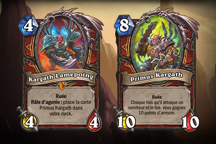Chaque classe dispose également d’une légendaire Primus. Ces dernières ont la caractéristique de coûter assez peu de mana et d’ajouter une carte très forte dans le deck du joueur via un effet râle d’agonie. Je n’ai pas testé plus que ça cette mécanique, mais je trouve l’idée sympathique car jouable en deux temps. De plus, l’effet râle d’agonie du serviteur de base peut être contré via un silence.