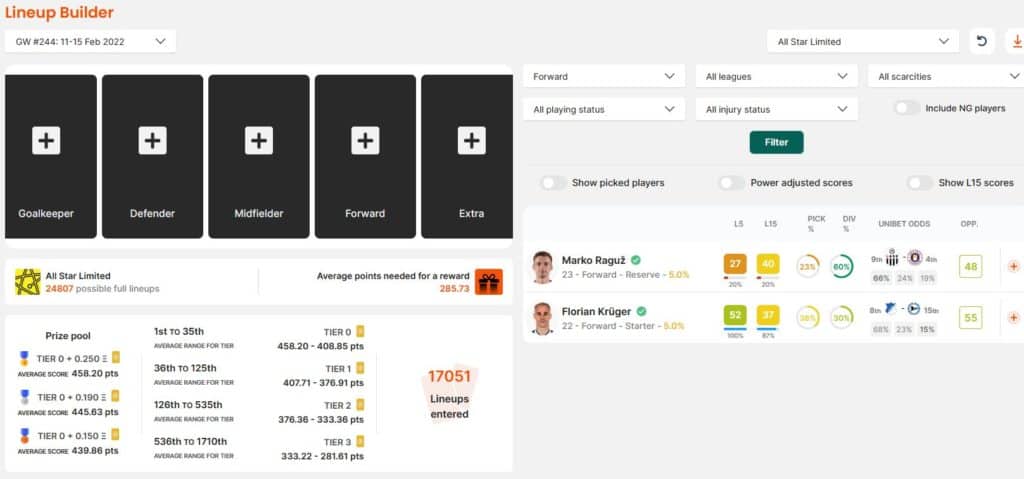Le LineUp Builder est l’outil qui vous permettra chaque semaine de construire votre équipe de la manière la plus optimale, en fonction de la ligue à laquelle vous participez et des cartes présentes dans votre galerie.