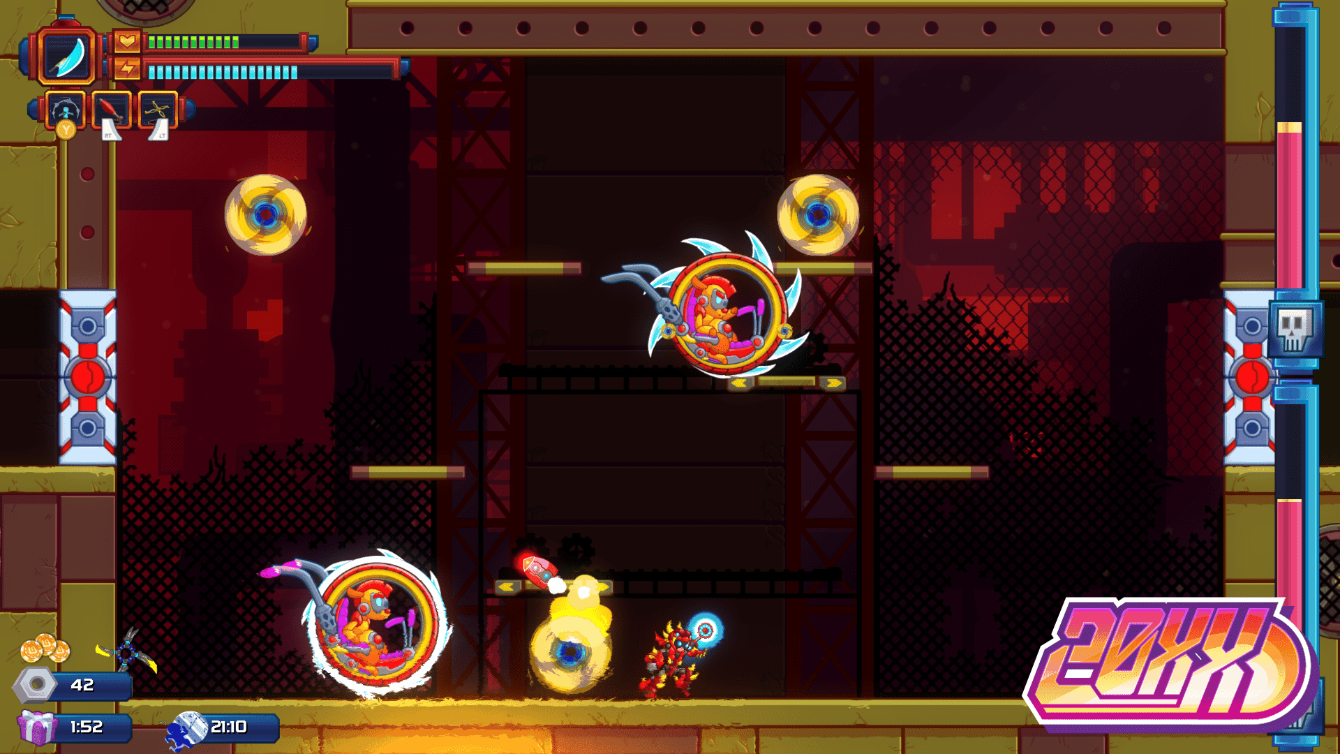 Dès le début, le jeu ne brille pas par son originalité. Les développeurs assument totalement leur inspiration et passion pour Megaman : les musiques, les décors des niveaux, le chara-design… Tout y est très ressemblant. Vous, et vos amis, pourrez donc incarner Nina (en amure bleue, et armée d’un canon intégré à son bras) ou Ace (en armure rouge, et armée d’un sabre énergétique). A noter tout de même que, malgré le manque d’originalité, ne ressort que ce qu’il y a de meilleur dans Megaman ; le gameplay est fluide et sans défaut ! Les différents niveaux sont divertissants, et les commandes sont simples et efficaces : un saut, un dash, une combinaison dash + saut, et une attaque. Comme dans Megaman, on pourra également acquérir en complément de nouveaux pouvoirs en battant le boss de fin de niveau.