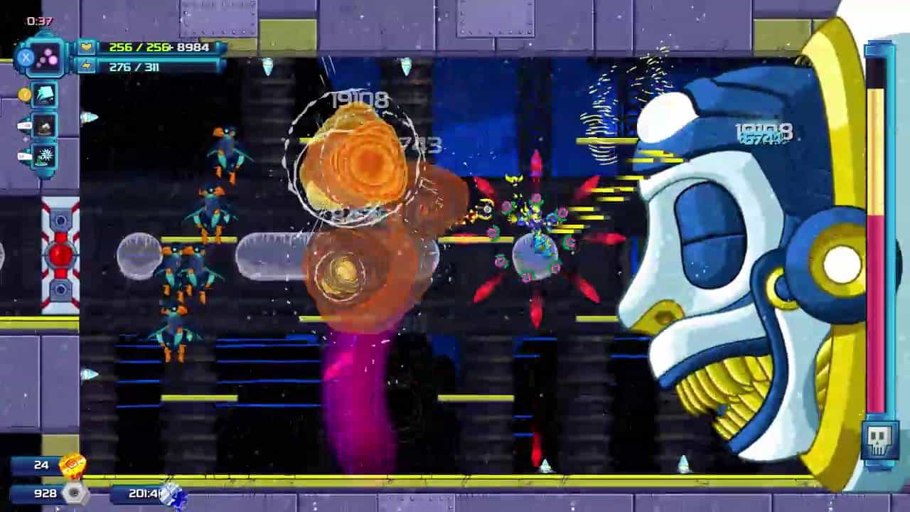 Voici la touche originale de ce jeu : revisiter Megaman à la sauce Roguelike ! Les niveaux sont générés de manière aléatoire et sont très bien construits. Vous devrez évoluer dans des phases de plateforme plus ou moins complexes, tout en esquivant les salves ennemies et en venir à bout bien sûr. Tout au long de votre aventure, vous aurez également la possibilité de pouvoir améliorer votre équipement, vos caractéristiques (vitesse, force, défense…), ainsi que vos différentes attaques. Les jetons, récoltés lors de votre run, vous serviront à acheter des boost en point de vie, énergie… A noter que seul le mode facile vous octroie 3 vies au début de votre partie.