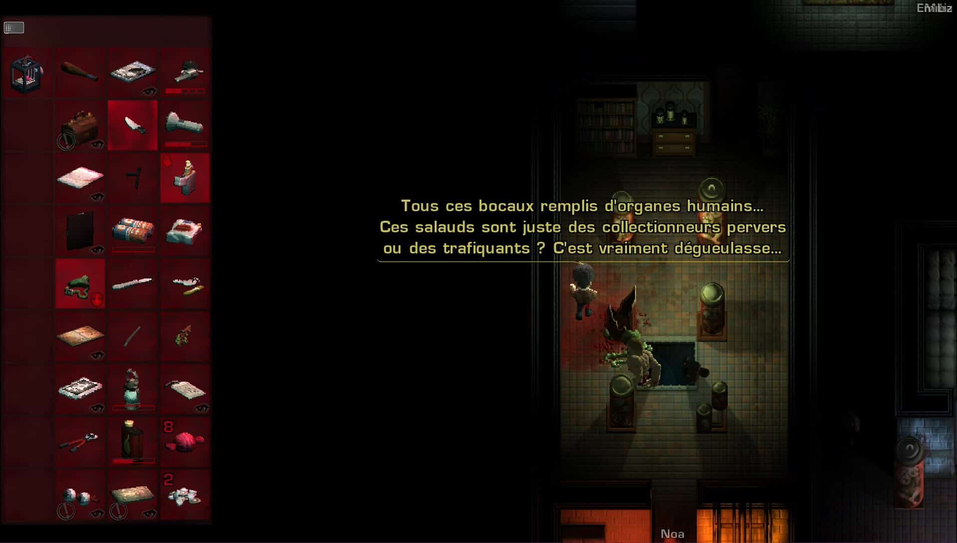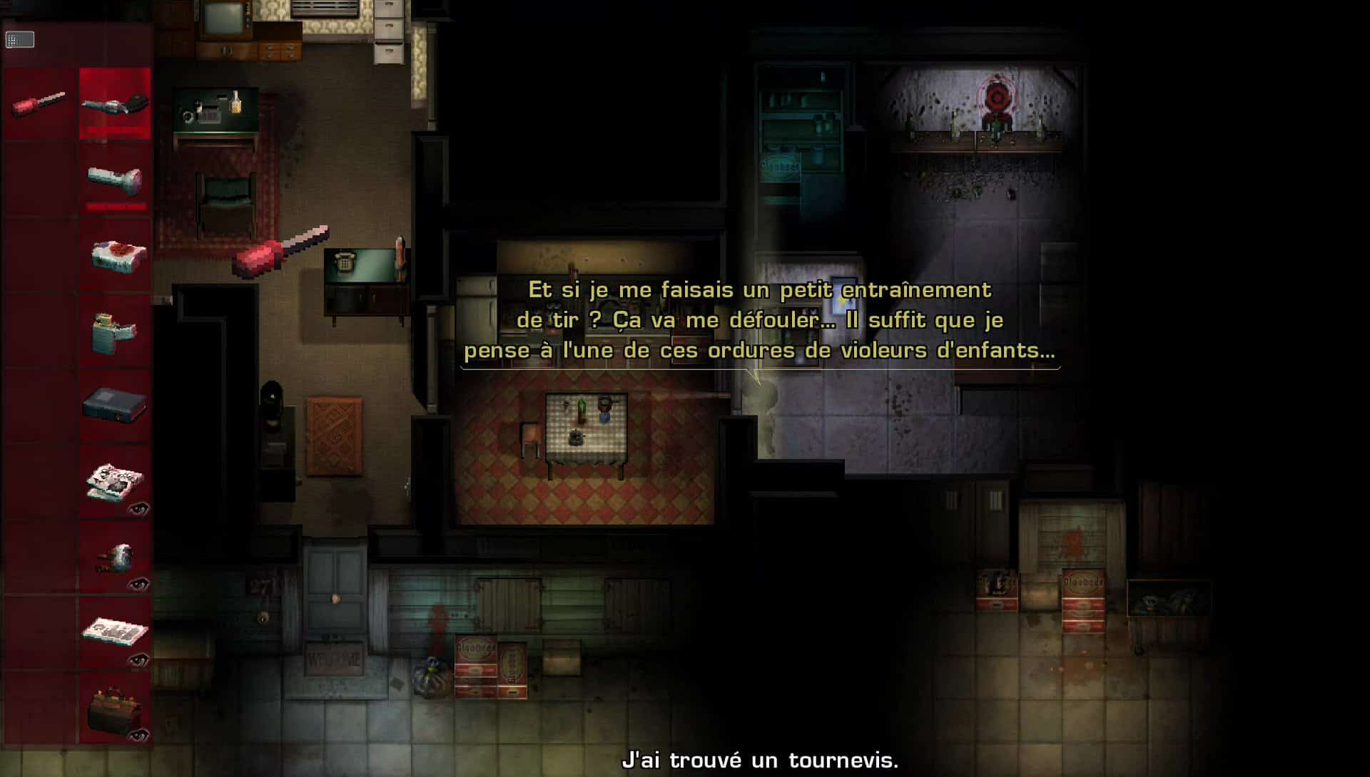 Graphiquement, 2Dark est difficile à juger vu que le jeu a été réalisé en pixel art. Comme je vous le disais plus haut, c’est un choix et pour ma part, cela ne me dérange pas. L’univers glauque est super bien représenté. Par contre, vu le coté hyper sombre du jeu, le manque de « netteté » graphique empêche parfois de voir au-devant de quoi on va avec le personnage. La bande son par contre est extrêmement bien faite et tous les bruits concourent à vous plonger dans cette ambiance polar en permanence. Que dire des pleurs d’enfants impossibles à atteindre qui risquent de vous glacer le sang. Jeunes parents s’abstenir.