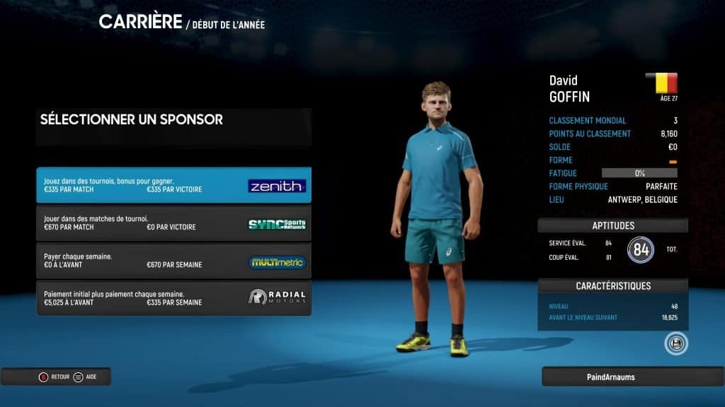Le mode carrière vous offrira la possibilité de commencer au bas de l’échelle ou bien de continuer avec un joueur expérimenté. Un peu chauvin, j’ai donc décidé de continuer la carrière de notre David Goffin national. Bien qu’assez complet, ce mode manque un peu d’âme et nous donne parfois plus l’impression de jouer à tennis manager.