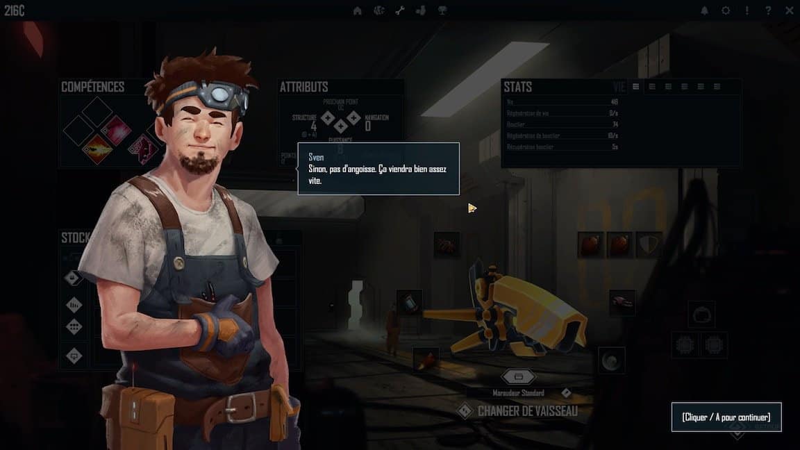 Au niveau du système RPG, il est assez complet. Attention que si certains sites le comparent à un Diablo en version shoot’em up, faut pas exagérer non plus ! Vous aurez le choix entre quatre compétences actives à configurer qui consomment votre énergie. Et deux compétences passives qui vous permettent de faire de votre vaisseau un vrai tank ou une fusée. C’est assez agréable de la part d’Alkemi d’avoir intégré ce système dans Drifting Lands. Il vous suffit de ramasser des pièces lors des niveaux et ensuite retourner au hangar pour modifier votre vaisseau comme bon vous semble. Simple mais fonctionnel !