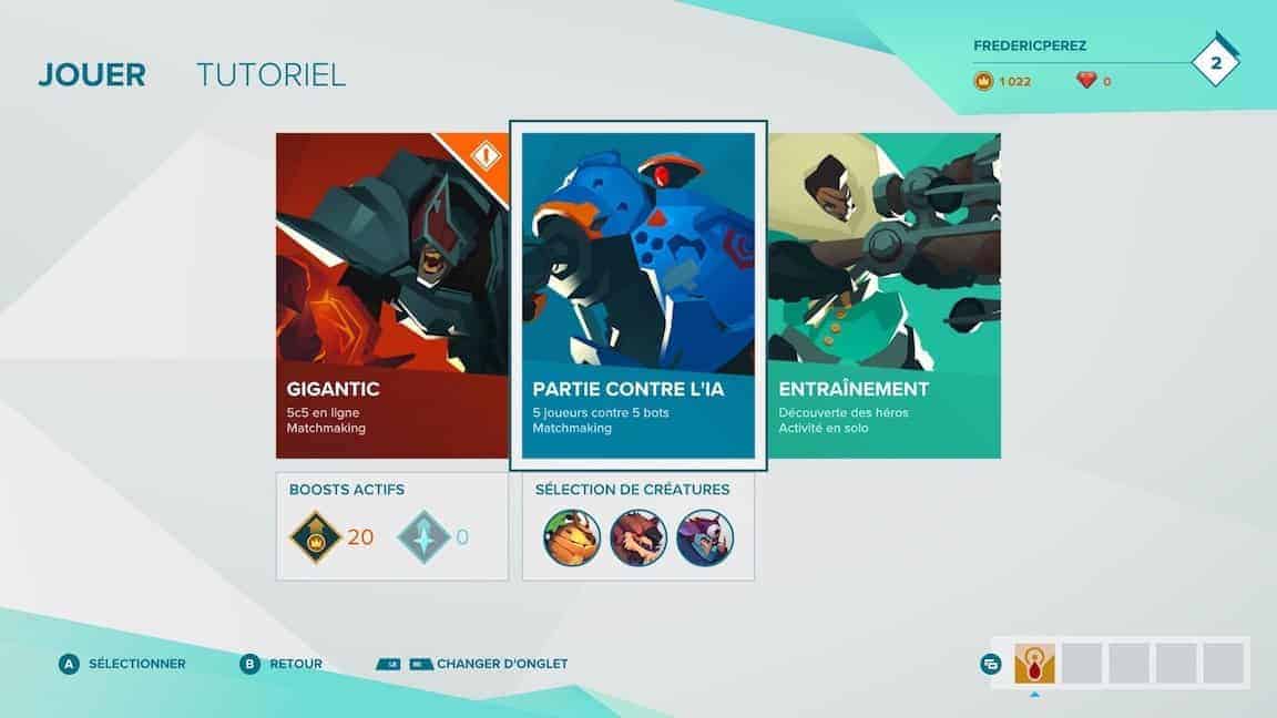 Gigantic ne s’encombre pas d’un mode histoire ou d’un quelconque scénario. Vous aurez droit à un tutoriel (obligatoire) et ensuite on vous jette dans l’arène ! Il n’existe pour l’instant que 3 arènes et vous ne pourrez jouer à toutes les arènes qu’après un certain nombre de match. En sachant que si l’un des 10 joueurs n’aurait pas encore accès à toutes les arènes vous seriez d’office dans la première. Autant vous dire que vous la connaîtrez par coeur celle-là ! Au niveau des modes de jeu vous pourrez optez pour du 5vs5 avec des joueurs en ligne ou du 5vsIA qui est exactement le même mode de jeu mais avec une équipe adverse contrôlée par l’ordi.