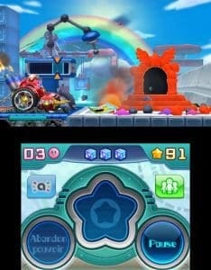 On pourrait facilement résumer Kirby Planet Robobot en un mot ; plaisir. Le plaisir de la prise en main tout d’abord. Il s’agit d’un jeu de plateformes accessible à partir de 7 ans donc celle-ci est immédiate et facilitée par des petites aides dans vos premiers pas. Kirby saute, aspire, recrache ; le tout avec un temps de réponse parfait. Rien de révolutionnaire jusqu’ici, ça ressemble à un Mario. Oui mais voilà, dans Kirby Planet Robobot, vous disposez de nombreux autres pouvoirs comme toujours dans Kirby. Kirby pourra ainsi, au fur et à mesure qu’il traverse les mondes, recevoir des pouvoirs temporaires lui permettant de se transformer en boule d’énergie, de lancer un boomerang et j’en passe. Encore une fois un peu comme dans un Mario, fluide et jouissif.