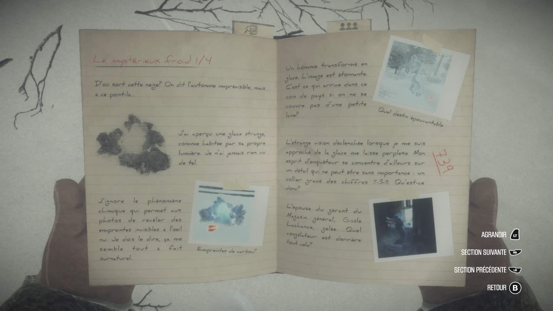 Dans Kona le réalisme est poussé à son paroxysme. Si vous accélérez ou freinez, vous verrez le pied de Carl bouger en conséquence. Envie de savoir où vous êtes ? Il vous faudra sortir votre carte à l’ancienne et voir les différentes notes de lieux s’ajouter au fur et à mesure de vos découvertes. Vous descendez du véhicule ? Le moteur continuera de tourner pour éviter de geler. Et ceux-ci ne sont que des exemples parmi tant d’autres que je vous laisse le plaisir de découvrir par vous-mêmes.