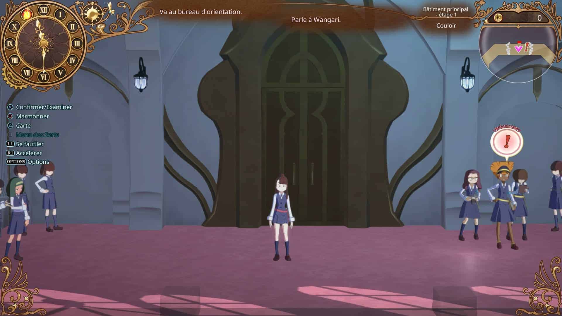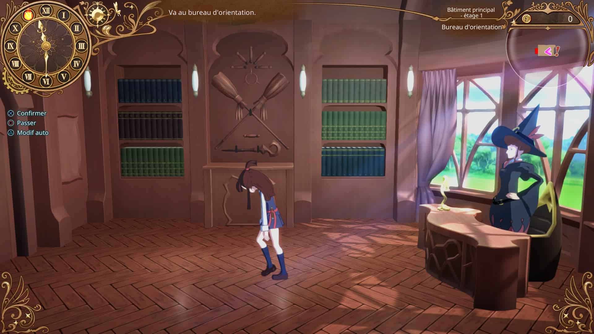 On se dit que la magie doit au moins jouer un rôle important mais durant les phases d’exploration, elle se limite à une pression de bouton pour provoquer un effet ponctuel. Enfin, à condition bien sûr que Akko soit munie d’une potion (difficile à trouver !), sans quoi elle ne peut lancer le sort car l’héroïne de Little Witch Academia n’a pas le tallent inné d’un Harry Potter. Et donc si vous voulez réparer une boule de cristal pour sauvegarder à l’aide d’un sort mais que vous n’avez pas de potion, il ne reste plus qu’à balancer la manette. Cette progression sabotée doit aussi beaucoup aux événements impossibles à retrouver puisqu’ils sont soumis à l’horloge du jeu et à des lieux bien spécifiques. En effet, on n’a absolument *aucune* indication (même minime) de nature à nous aiguiller. C’est donc reparti pour des allers et retours interminables… *bruit de choc d’une manette contre un mur*