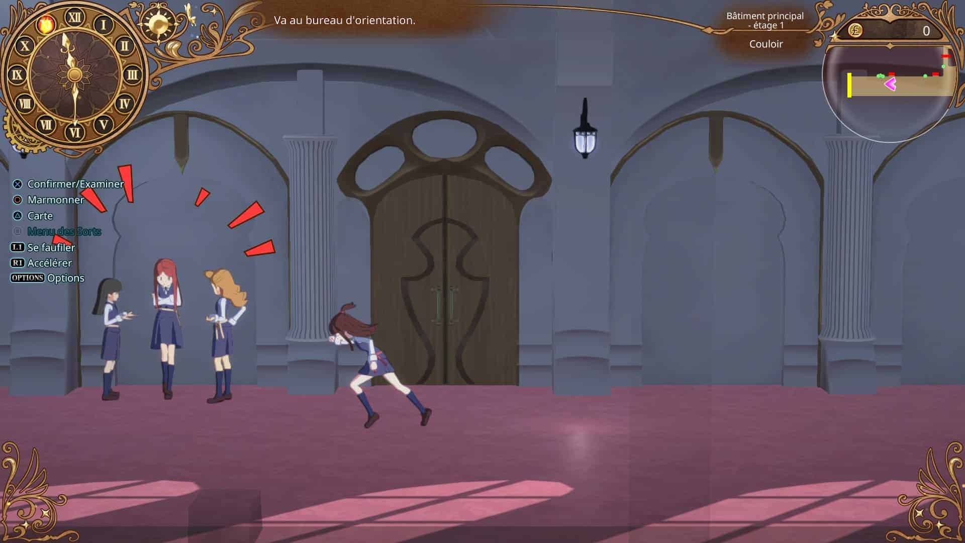 Bon, c’est pas super joli mais est-ce au moins agréable à jouer ? Penses-tu ! Et le pire, c’est que l’arnaque est la même. Les premières minutes donnent l’impression d’évoluer dans un contexte scolaire riche, avec des conversations qu’on peut épier par-ci, des PNJ qui nous interpellent par-là, le tout agrémenté de dialogues dans l’esprit et le ton du DA. On a même droit à des extraits animés présentant les personnages afin que les néophytes s’y retrouvent facilement. Excellente idée dans le cadre d’une adaptation ! Mais là encore, le retour à la réalité s’avère brutal. On se met à déambuler dans les couloirs inertes et sans vie de l’Académie, on enchaîne les va-et-vient fastidieux et on peste sur la carte ainsi que la mini-map aux angles douteux et à la lecture improbable. Gros soupir.