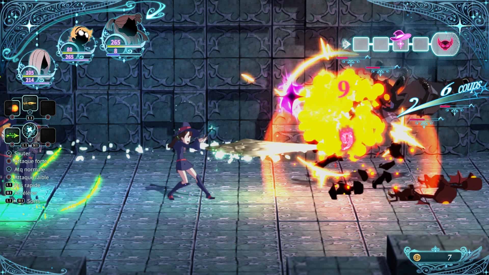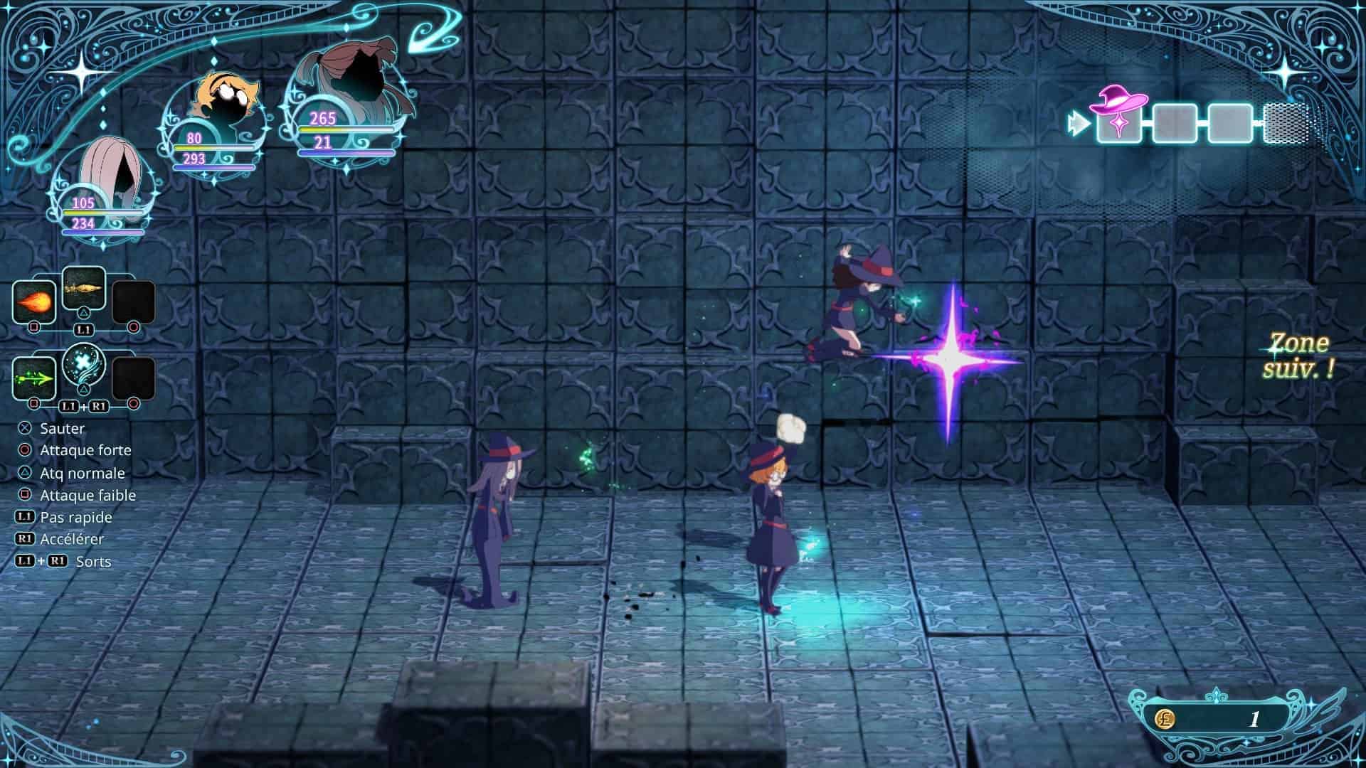 Reste le gameplay en donjon, visuellement pauvre comme je l’ai déjà mentionné. Mais aussi ennuyeux à mourir. Lourd et soporofique, le gameplay part pourtant d’une bonne idée : on dispose de trois touches d’attaque magique (légère, moyenne et lourde) et de combinaisons de sorts customisables grâce aux touches L1 et R1. Et si les sorts s’avèrent passablement jolis, ils s’inscrivent dans la molesse générale du jeu, si bien qu’on ne retrouve absolument pas le dynamisme des concurrents du genre (qui a dit Dragon’s Crown ?). Résultat : on s’ennuie et on a très vite envie d’arrêter de jouer. Je vous le dis d’ailleurs en toute franchise, je n’ai pas tenu bien longtemps sur ce Little Witch Academia : Chamber of Time.