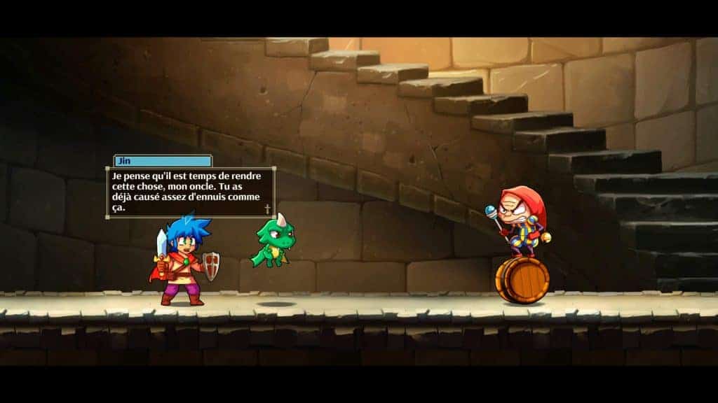 Votre objectif sera d’incarner Jin afin de tenter de retrouver les orbes cachées dans le royaume de Monster World, pour sauver ses habitants d’un sort maléfique transformant tout le monde en animaux plus bizarres les uns que les autres. Pour rappel, Monster Boy est un metroidvania ou l’on enchaîne les tableaux/plans et dans lesquels la progression se fait en mode plateformes. Énigmes et dextérité vous permettront de continuer à progresser dans votre aventure.