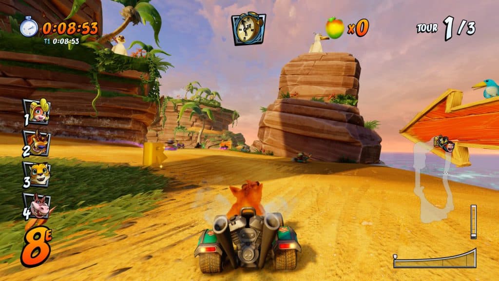 L’avantage lorsqu’on rejoue à un jeu auquel on a joué 20 ans auparavant, c’est qu’on en a un souvenir daté, surtout pour ce jeu sorti sur Playstation 1ere du nom. Même si on doit reconnaître le travail indéniable des équipes de développement afin d’adapter Crash Team Racing aux consoles dernière génération, le résultat est quelque peu décevant. Bien sur le jeu est joli, hyper coloré et vraiment bien fluide sans pour autant être net. Et lorsqu’on réalise que sur Nintendo Switch (console utilisée pour ce test), celui-ci ne tourne qu’à 30 FPS, c’est carrément décevant. Mario Kart, sorti il y a déjà quelques années tourne lui en 60 FPS. On se demande donc pourquoi Crash n’a pas pu en faire autant.