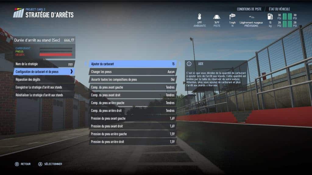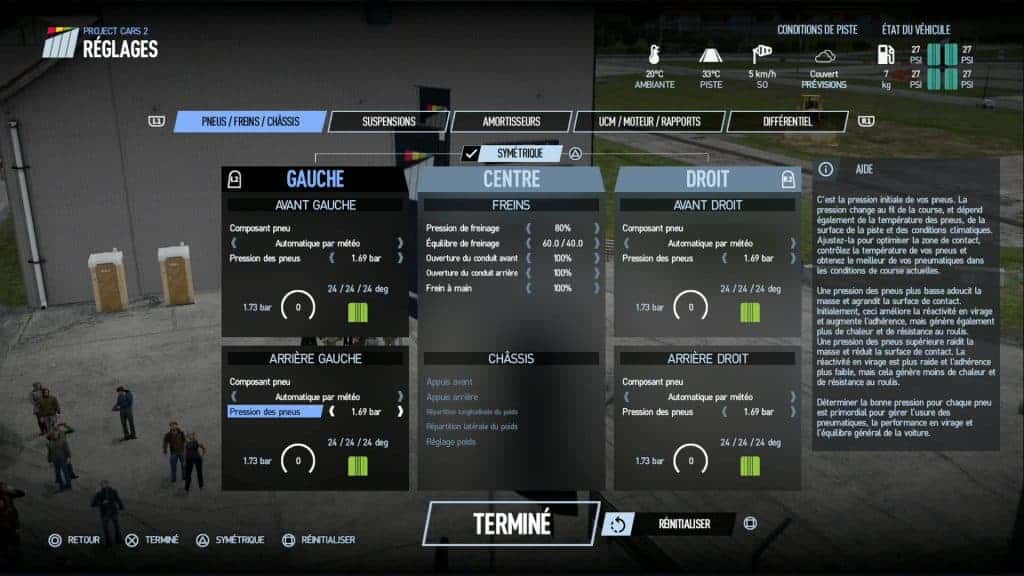 Paramètres – Tout simplement bluffant tant la quantité de choses que vous pouvez paramétrer est immense. Outre les réglages classiques, vous pourrez aller jusqu’à régler la pression de chacun de vos pneus…Quel souci du détail!
