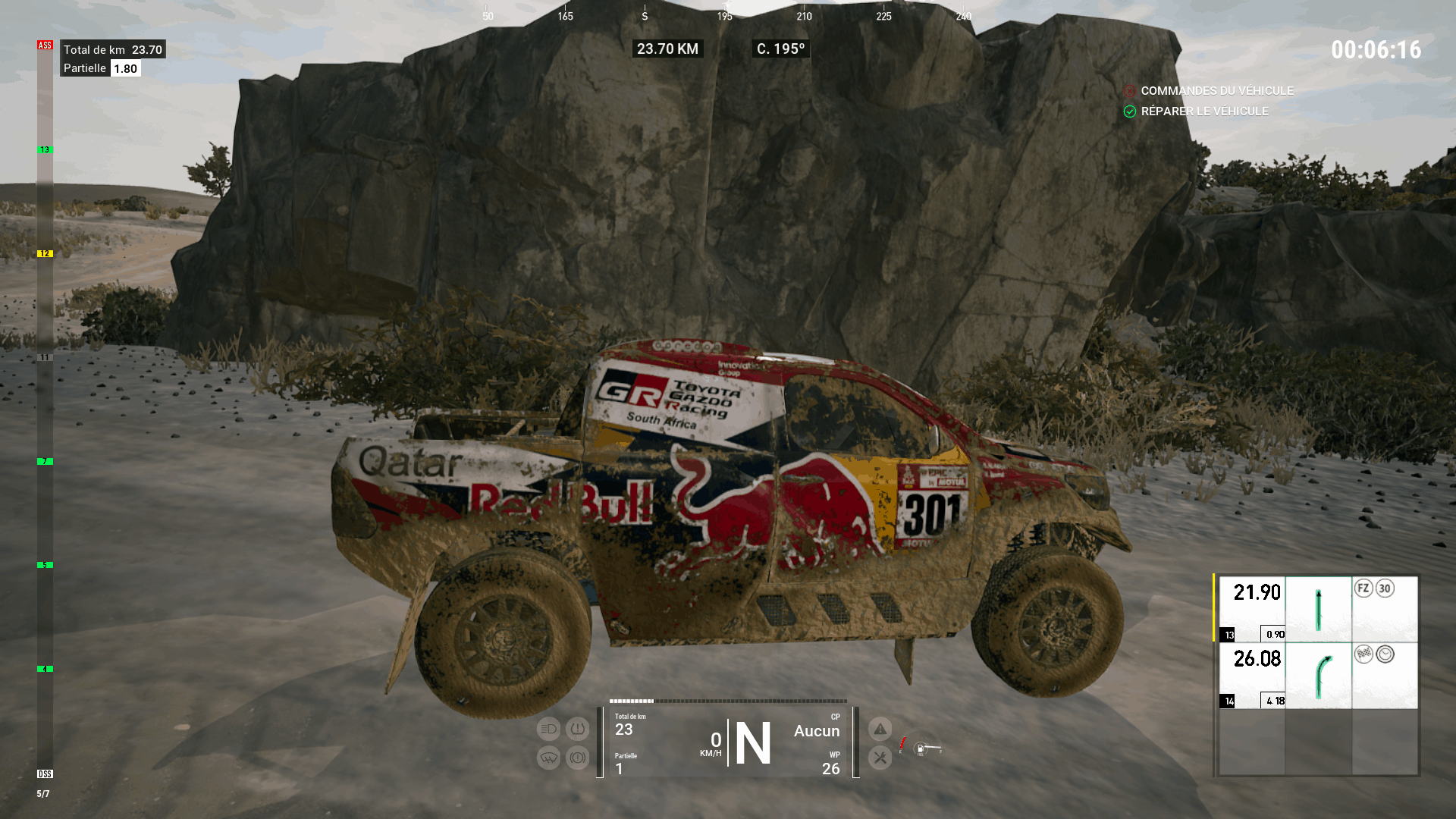 On commence alors par un tutoriel (obligatoire et en anglais seulement comme tout le reste d’ailleurs). C’est là qu’on découvre le système de waypoints et de navigation complètement propre au rallye raid. En effet, là où vous allez, il n’y aura bien souvent pas de route (la route, quelle route…bon ok je sors) et il faudra suivre des caps et autres objets sur le parcours afin de vous orienter. Je ne connaissais pas vraiment et je vous avoue que c’est super bien fait et déroutant à la fois. Vous entendre dire : cap 268 degrés avec les palmiers sur la droite…Si vous ne voyez pas les palmiers, vous êtes perdus.