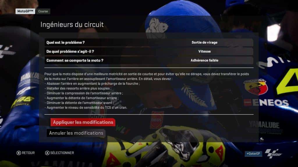 A ce niveau-là, je dois dire que c’est franchement impressionnant. On se rend compte que c’est bien là-dessus et sur le tracé des circuits que Milestone a mis le paquet. Les sensations sont immédiates et hyper bonnes, on ressent de suite la moto. Que vous soyez novice ou expert, la quantité impressionnante d’options d’aide à la course permettra de jouer selon votre niveau. J’ai pour ma part adoré l’apport de l’ingénieur de piste. Celui-ci vous aidant à améliorer (et donc de comprendre) les paramètres de votre moto en répondant à de petites questions qui permettront à votre ingénieur de vous conseiller pour tel ou tel réglage.
