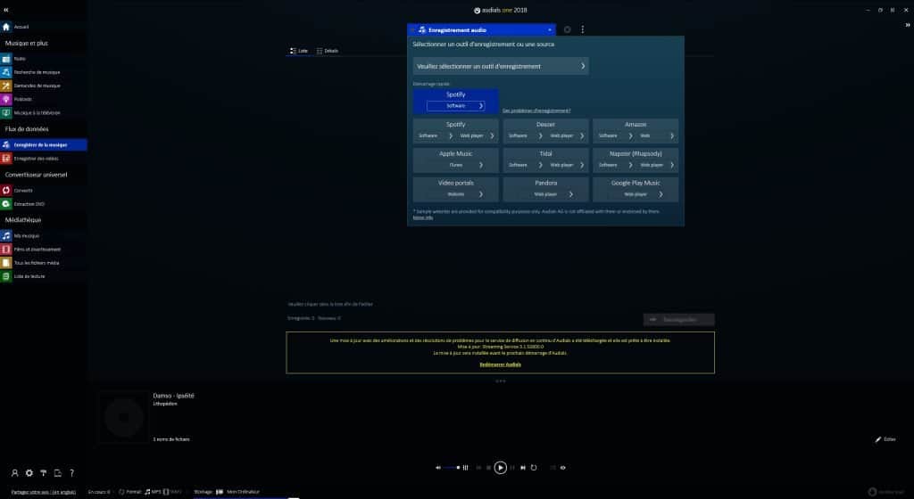 Cette partie de l’application est particulièrement intéressante puisqu’elle permet d’interfacer Audials avec les services payants les plus populaires : Netflix, Hulu, Spotify, Amazon Prime Video. Avec Spotify par exemple, le système lance l’application ou le client web afin d’enregistrer vos playlists en MP3. Des options bien pratiques permettent d’accélérer fortement le processus en jouant la musique en vitesse accélérée et en lançant les enregistrements en simultané.