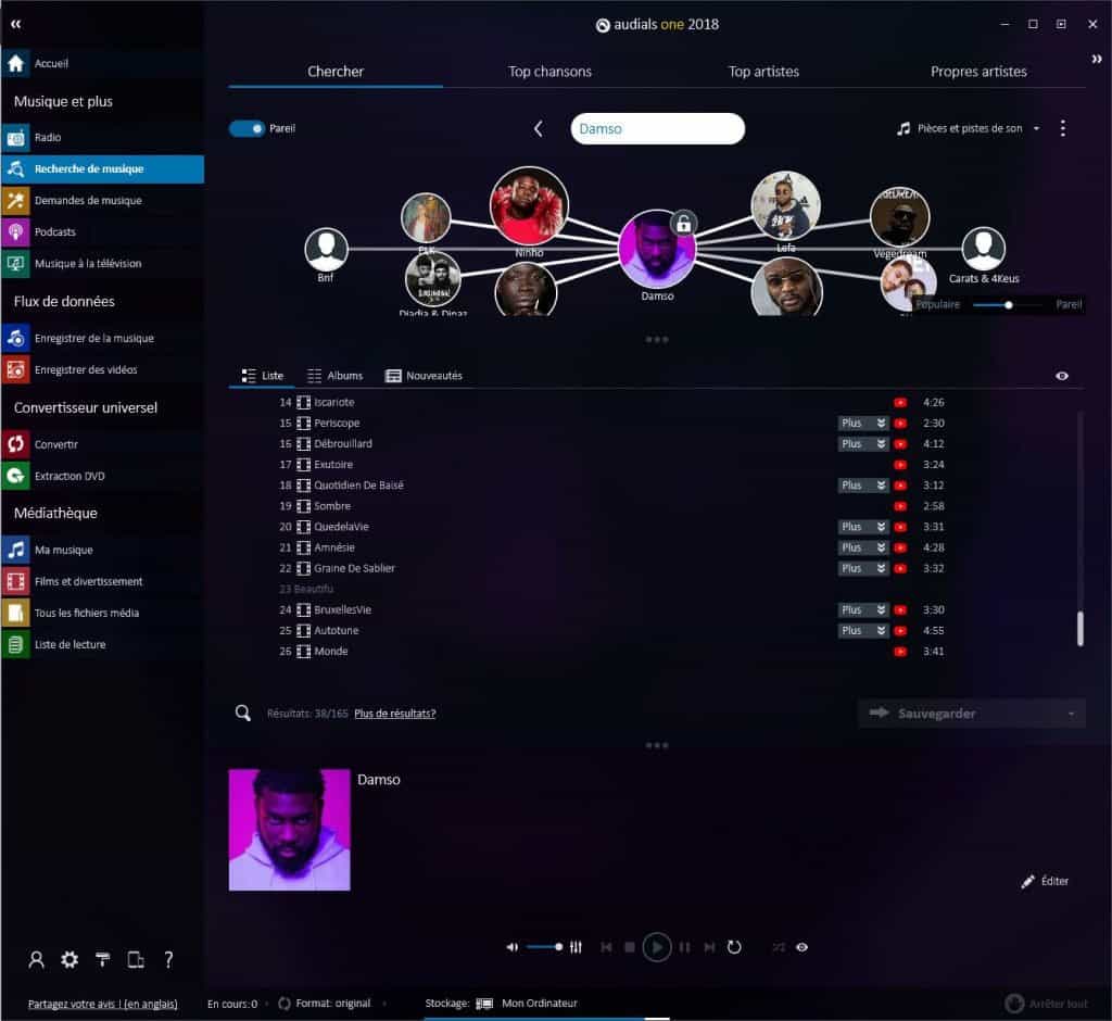 Si cela ne vous suffit pas, vous pouvez faire une recherche sur un artiste ou une chanson, le moteur de recherche parcourt alors la toile afin de trouver le contenu disponible sur les différentes plateformes. En quelques clics, on lance le téléchargement des vidéos ou mp3 sur son ordinateur. À l’aide d’algorithmes d’association pertinents, Audials va même plus loin en proposant des recommandations au travers des artistes ou titres similaires susceptibles de vous intéresser.