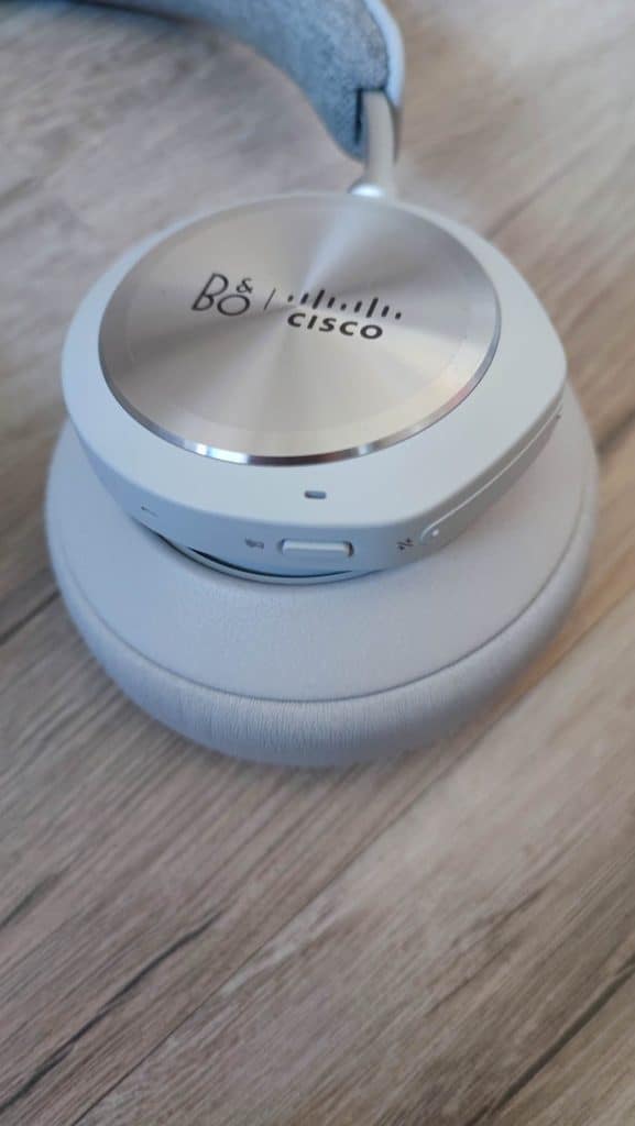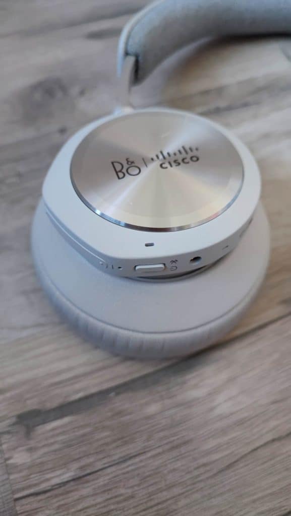Au niveau des fonctions sur le casque, sur l’oreillette droite, on retrouve l’entrée jack, l’entrée USB-C, le bouton power/Bluetooth et un slider pour augmenter ou diminuer le volume. Pour le reste, une double pression sur l’oreillette (elle-même décorée des logos B&O et Cisco), permettra de mettre la musique en route ou sur pause ou bien de décrocher un appel téléphonique.
