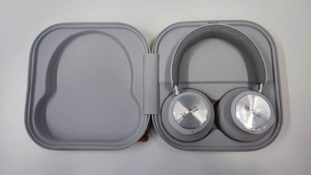 Au déballage, on retrouve le casque Bang & Olufsen Cisco 980 dans une magnifique housse rigide estampillée des logos B&O et Cisco.