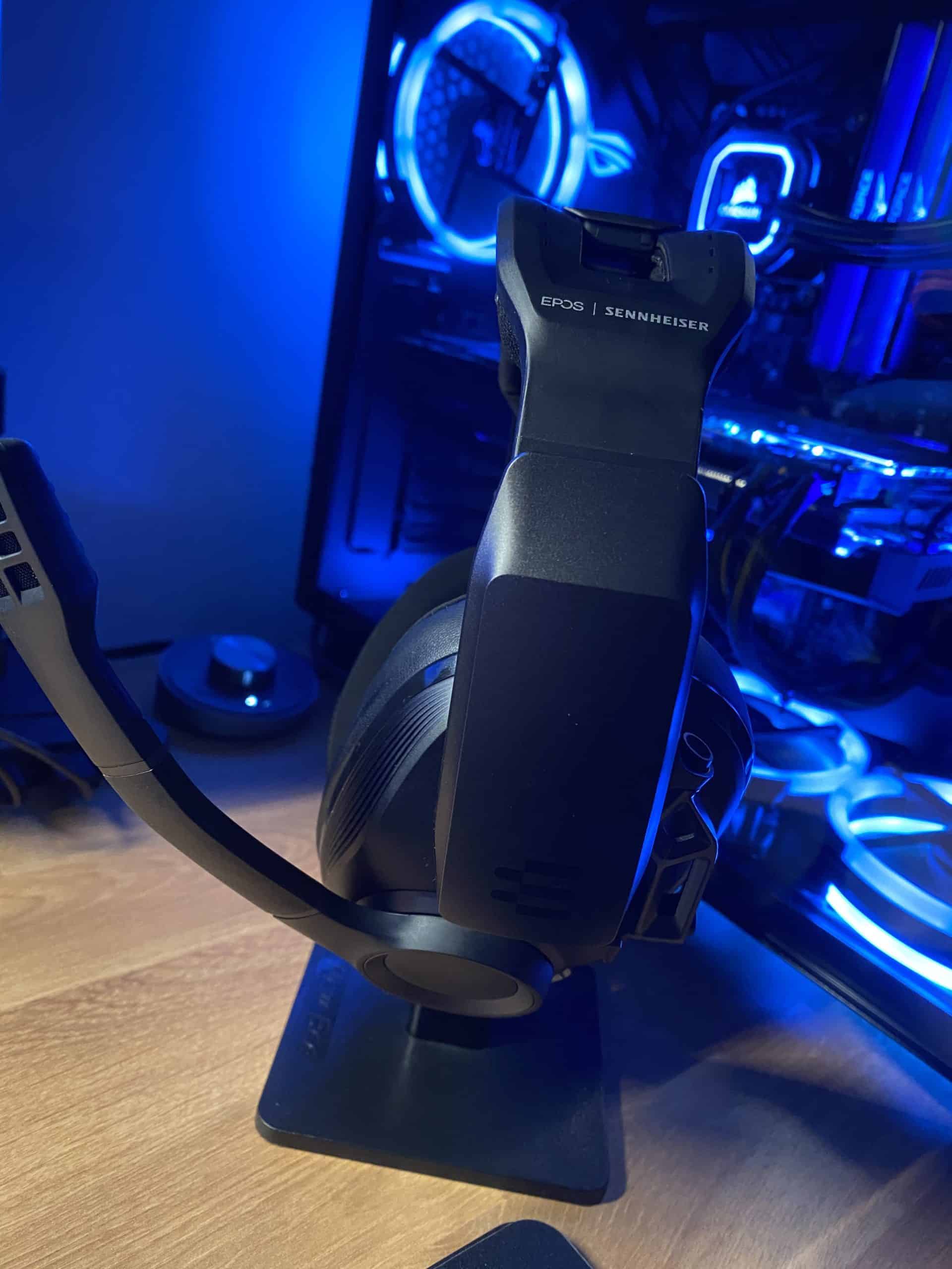 Comme je vous le disais : à première vues, ça peut en rebuter plus d’un. Mais quand on a pris le temps de l’observer, de l’utiliser, de le poser sur un socle, on se rend compte qu’il est certes massif mais qu’il s’intègre parfaitement dans un univers gaming. Selon moi, il a un petit look d’armure Halo, avec ses lignes bien tracées, son relief sur certaines parties pour au final rester sobre pour du matériel de gamer. On est loin des loupiotes RGB et autres designs criards. Et c’est très bien comme ça. En bref, il existe des casques bien moins sobres limite trop classiques à contrario des extrêmes qui se veulent beaucoup trop gaming. Ici, EPOS tape en plein milieu et il fait ça plutôt bien.