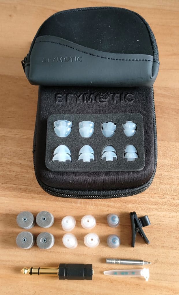 Au déballage des écouteurs, vous trouverez une quantité impressionnante de compléments. Une housse rigide qui permet de protéger à la fois les écouteurs mais également votre lecteur audio numérique tel que le COWON Plenue D3, testé récemment. Une petite housse de transport pour n’emporter que le minimum et, pour finir, un très grand nombre d’embouts en tous genres. 4 paires en silicone avec 2 ailettes, 4 paires en silicone avec 3 ailettes et 2 paires d’embouts en mousse. Ajoutez à cela 2 paires de filtres avec le petit outil pour les remplacer et même un adaptateur pour prise casque. Avec tout cela, on peut vraiment dire que l’on est gâtés.