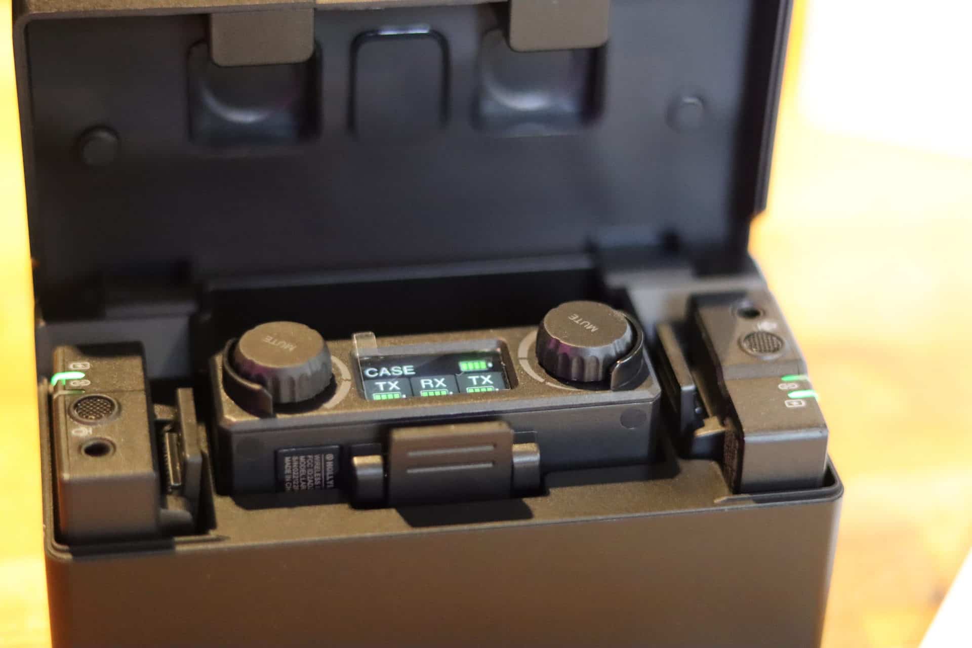 Tout d’abord, le kit se balade dans un écrin aimanté de toute beauté et de tout confort. En effet, le boitier permet de charger les deux émetteurs et le récepteur que vous poserez sur votre caméra. Chaque micro a une autonomie d’environ 5 heures et le boitier recharge le tout en une heure. Le récepteur va tenir 8 heures. J’ai utilisé le kit lors d’un enregistrement en extérieur durant le test. L’enregistrement a duré 4 heures et tout a fonctionné à la perfection. Il est bon de noter que vous pouvez porter le récepteur directement clipsé à votre vêtement ou le relier à un micro-cravate conventionnel, pour un son de meilleure qualité. Les deux micro-cravates sont évidemment fournis dans le pack.