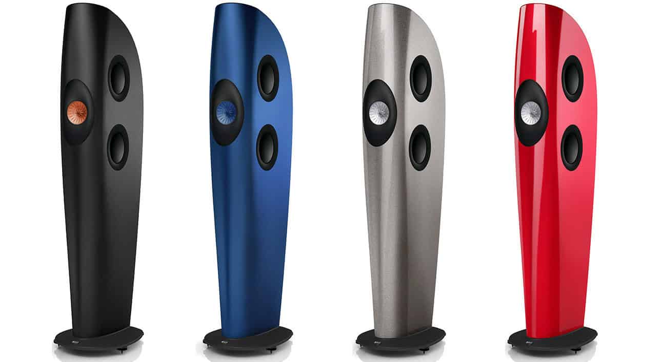 - Huit finitions sont disponibles en mélangeant cinq finitions d’enceintes avec six couleurs de cône de haut-parleur : Piano Black/Cuivre, Piano Black/Grey, Frosted Blue/Blue, Frosted Blue/Bronze, Charcoal Grey/Red, Charcoal Grey/Bronze, Racing Red/Grey Blanc arctique/Champagne