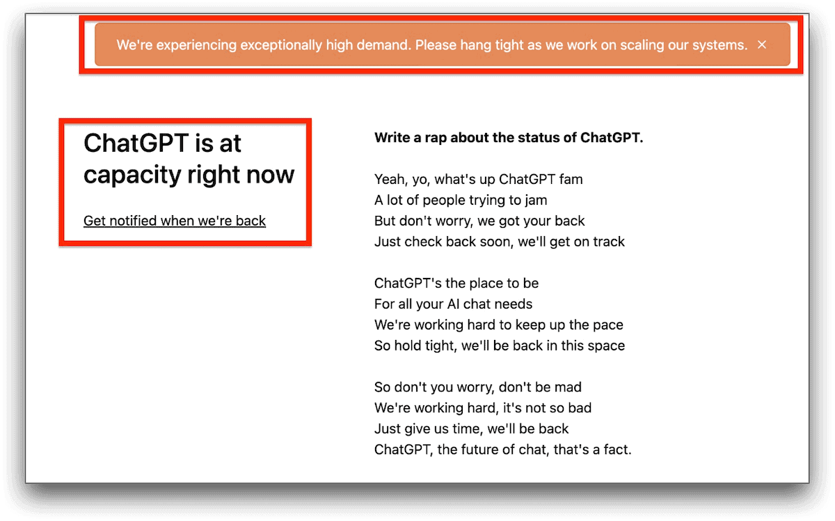 Traduction en français : « ChatGPT est à pleine capacité”