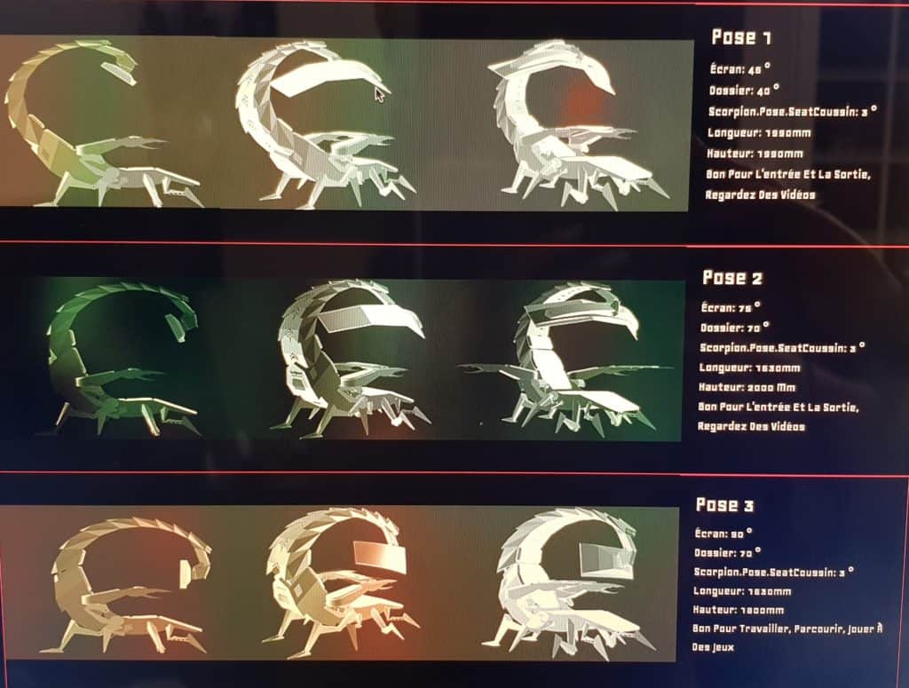 La pointe de la queue de la chaise est utilisée pour monter un ensemble de cinq écrans plats (entre 19 et 32 pouces) ou un écran super large jusqu’à 49 pouces. L’angle et la distance du moniteur sont réglables entièrement et vous offriront les positions que vous désirez. Le corps du Scorpion avec ses repose-jambes est l’endroit où vous pouvez choisir de vous asseoir ou de vous allonger selon les 6 réglages pré-établis.