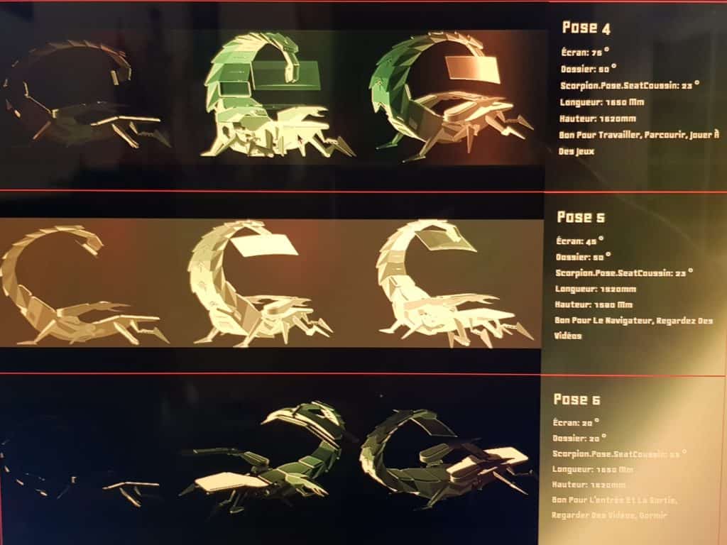 Chaque aspect de la plate-forme, du support de moniteur réglable aux accoudoirs en passant par ses huit pieds, a été conçu dans un objectif d’ergonomie suprême. Se convertissant en six poses différentes, le siège mécanique reproduit les positions des scorpions pour fournir aux utilisateurs des orientations dynamiques pour maximiser les performances.