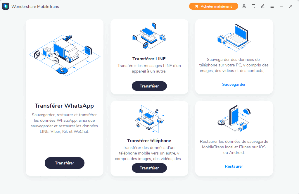 - Gérez vos données WhatsApp sans pertes. Alors que WhatsApp reste de loin l’application de messagerie la plus populaire, il lui manque une fonctionnalité essentielle : le transfert de données entre écosystèmes. C’est là que MobileTrans intervient. Vous pouvez sauvegarder, restaurer et transférer tous vos contenus WhatsApp en un clin d’œil et même garder l’historique de vos discussions intact.