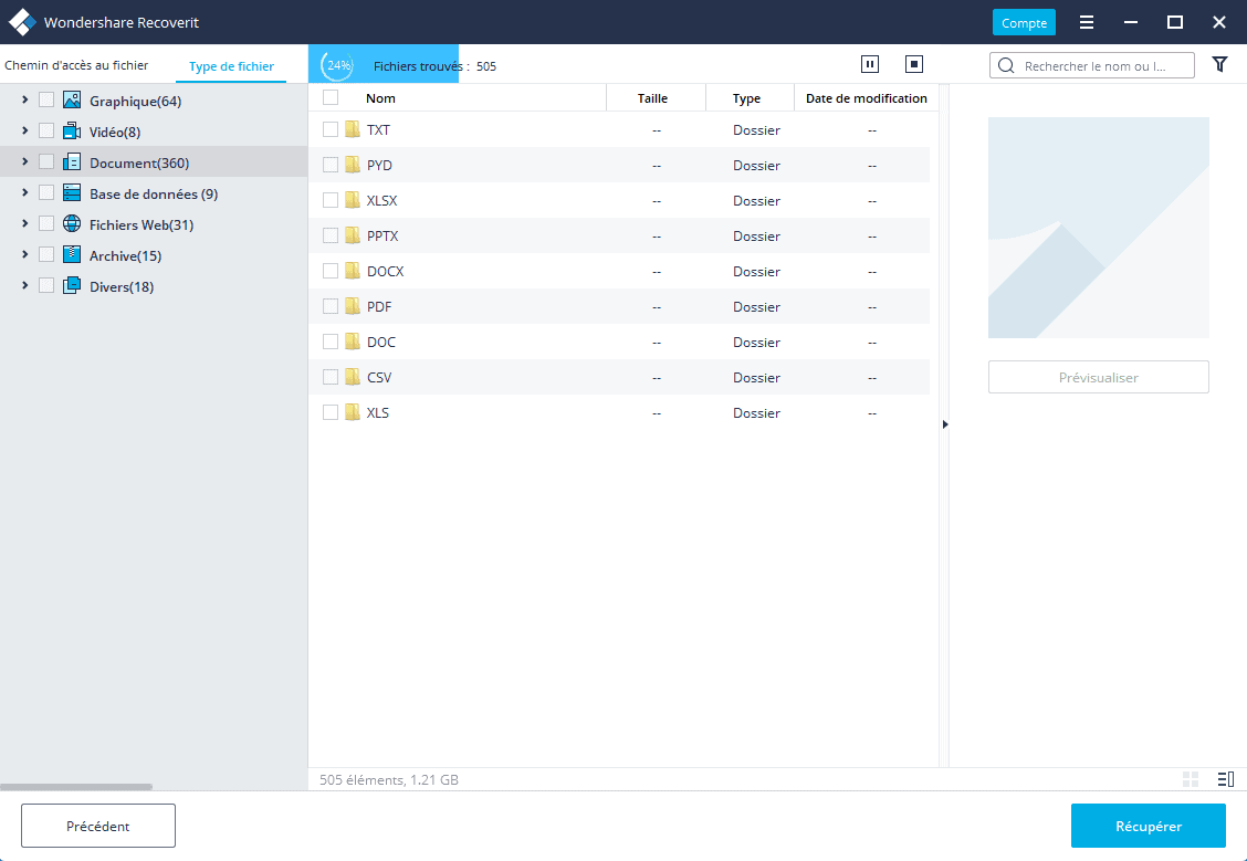 Une fois le scan terminé, vous naviguez intuitivement dans l’interface pour rechercher vos fichiers manquants. Vous pouvez classer les résultats en filtrant par type, taille de fichier ou date. Une fonction de recherche vous facilite grandement ce travail. Lorsque vous repérez un fichier ou document cible, vous pouvez facilement obtenir un aperçu pour vérifier son intégrité. Enfin, le bouton « Récupérer » vous permettra d’extraire vos données vers un nouvel emplacement.