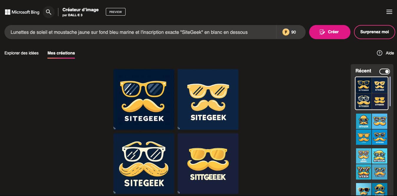 Nous avons soumis au Créateur d’image par DALL-E 3 de Microsoft Bing la requête suivante : « Lunettes de soleil et moustache jaune sur fond bleu marine et l’inscription exacte “SiteGeek” en blanc en dessous », et voici le résultat :