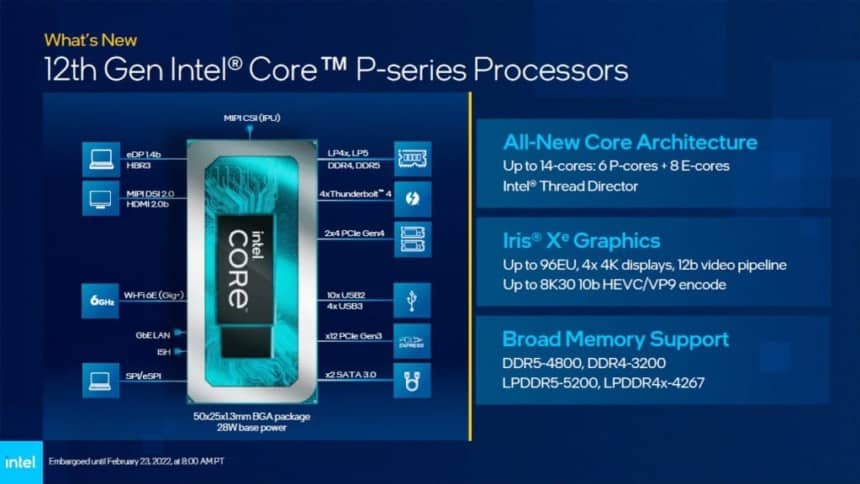 Au total, les gammes P-series (28 W) et U-series (15 W et 9 W) des processeurs Intel Core de 12e génération (Alder Lake) pour les ordinateurs portables représentent 20 puces adaptées à une large gamme de matériel. Les premiers modèles de PC portables équipés de ces nouveaux processeurs devraient arriver au mois de mars.