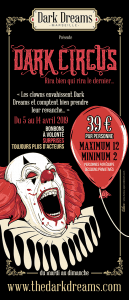 “Adeptes de sensations fortes et de grands frissons : vivez vos pires cauchemars au travers d’un spectacle hanté des plus réalistes ! Acteurs, effets spéciaux, décors immersifs et interactifs, Dark Dreams vous propose une aventure hors du commun. Le parcours, semé d’embuches, vous réservera de nombreuses surprises ! Personne ne sait quand et comment vous en ressortirez… En groupe de 2 à 12 joueurs, venez relever le défi dans ce labyrinthe de l’horreur de 600m2 !”